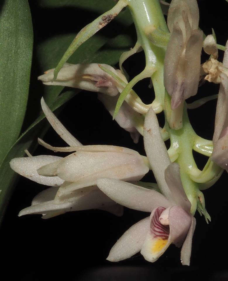 The terrestrially growing orchid species Geodorum recurvum (Roxb.) Alston 1931 is endemic to South China. In 1795 the Scottish botanist William Roxburgh (1751 – 1815) described the Geodorum recurvum orchid species as Limodorum recurvum Roxb 1795, which is still accepted as a synonym. In 1931 the English botanist Arthur Hugh Garfit Alston (1902 – 1958) changed the botanical name to Geodorum recurvum. Inflorescences reach a length up to about 20 cm and carry up to about 20 white flowers. Single Geodorum recurvum flowers get a size of about 2 cm