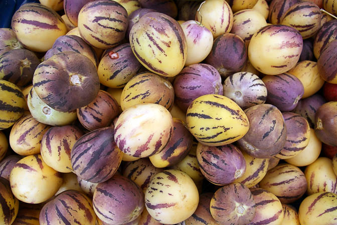 It is known as pepino dulce (“sweet cucumber” in English, in order to differentiate it from cucumber which is also called “pepino” in Spanish) or simply pepino; the latter is also used for similar species such as “S. mucronatum” (which actually seems to belong in the related genus Lycianthes). The pepino dulce fruit resembles a melon (Cucumis melo) in color, and its flavor recalls a succulent mixture of honeydew and cucumber, and thus it is also sometimes called pepino melon or melon pear. Another common name, “tree melon”, is more often used for the papaya (Carica papaya) though the pepino dulce plant generally does not look much like a tree; it looks more like a ground cover, trailing plant. The present species is, however, a close relative of other nightshades cultivated for their fruit, including the tomato (S. lycopersicum) and the eggplant (S. melongena), which its own fruit closely resembles
